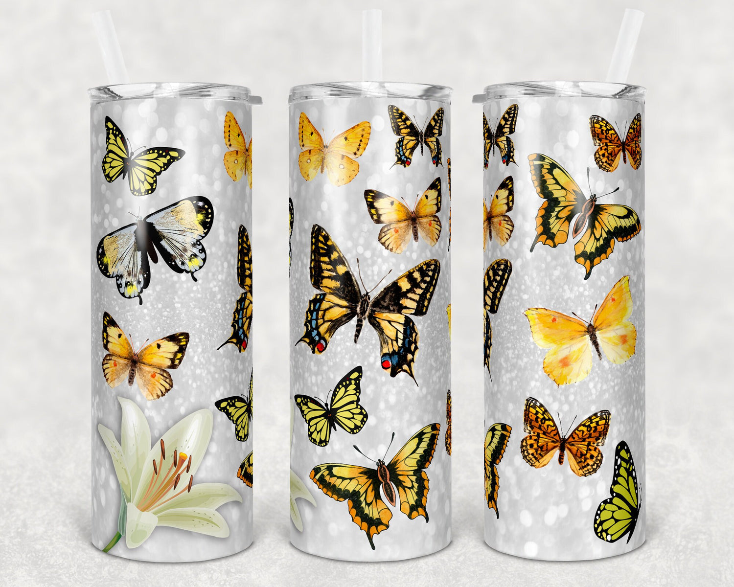 20 oz Skinny Tumbler Butterflies Yellow Butterfly Glitter Sublimation Design Print Transfer