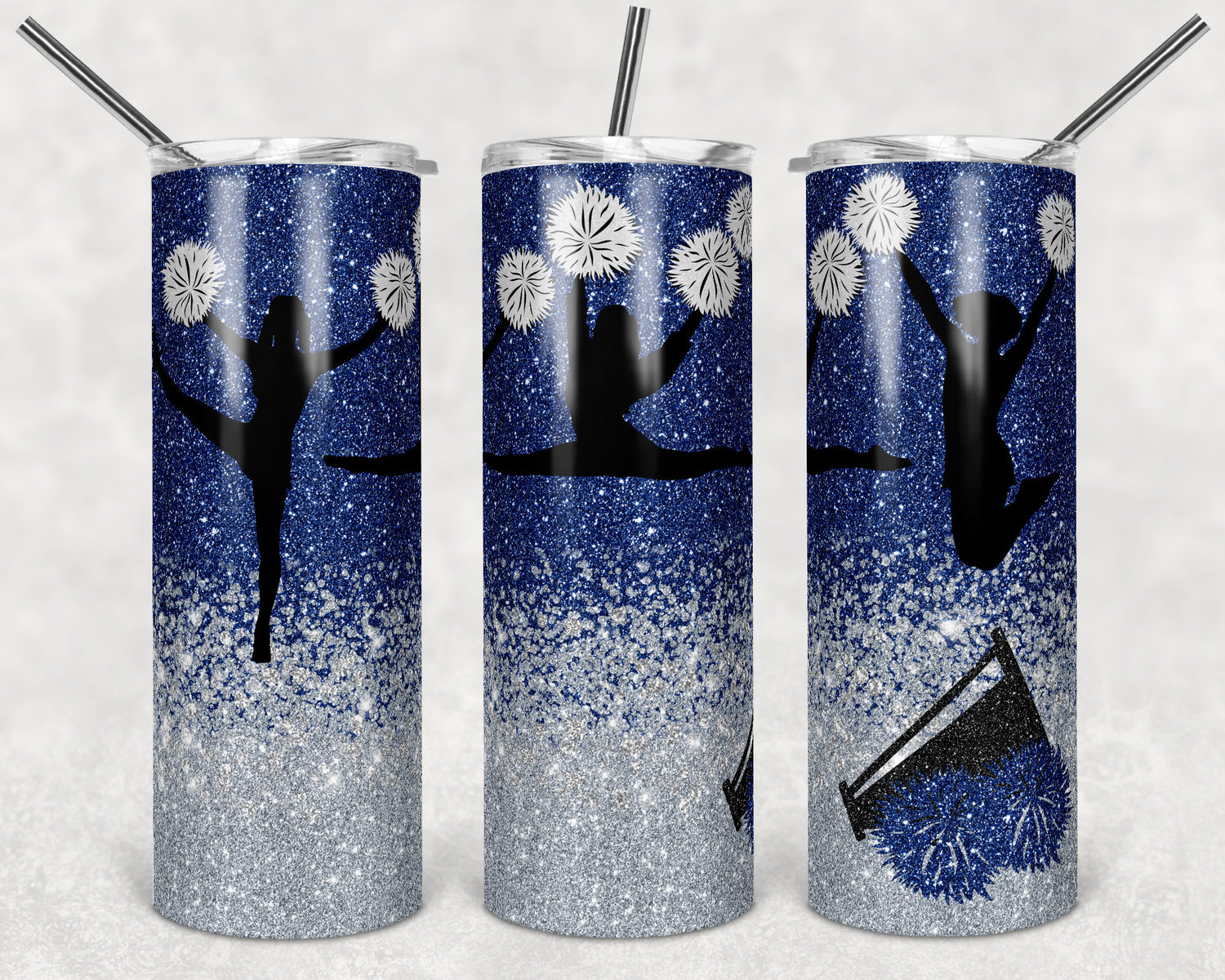 20 oz Skinny Tumbler Cheer Blue Silver Glitter Sublimation Design Print Transfer