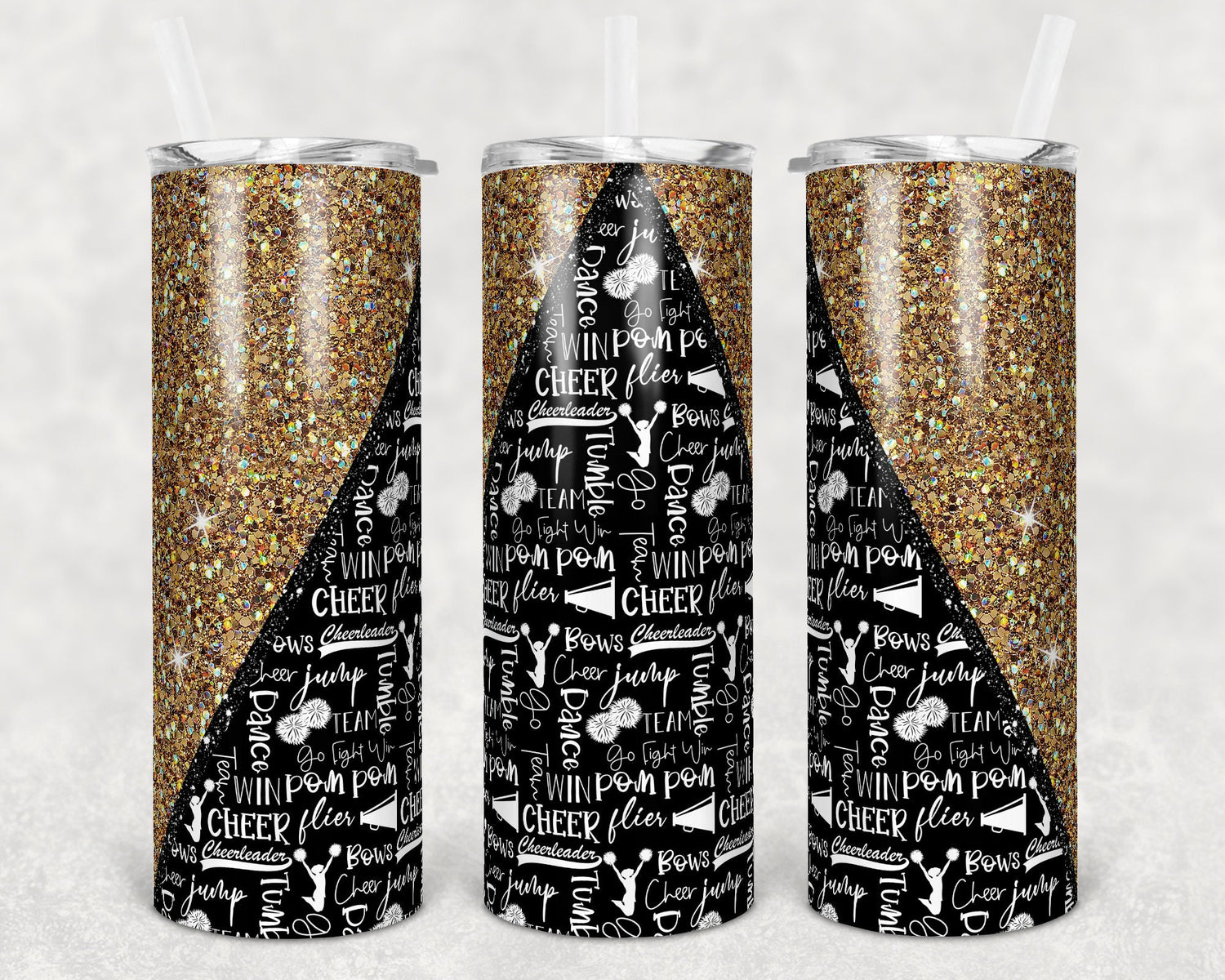 20 oz Skinny Tumbler Cheer Gold Glitter Cheer Cheerleading Sublimation Design
