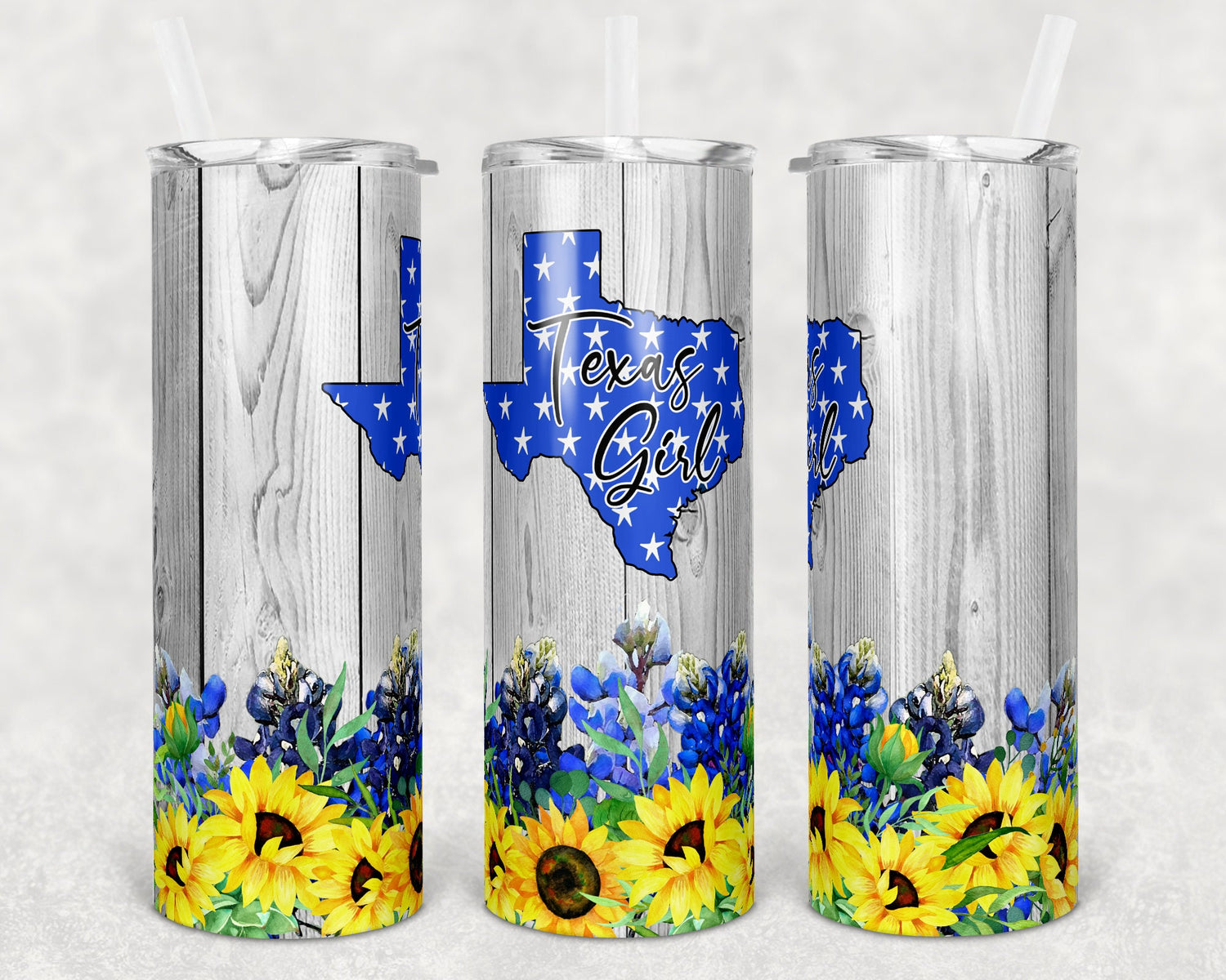 20 oz Skinny Tumbler Floral Blue Bonnet and Yellow Sunflower Faux Wood Texas Sublimation Design