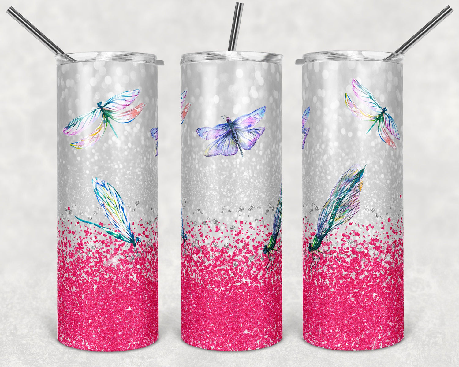20 oz Skinny Tumbler Glitter Dragonfly hot pink Sublimation Design Print Transfer butterfly
