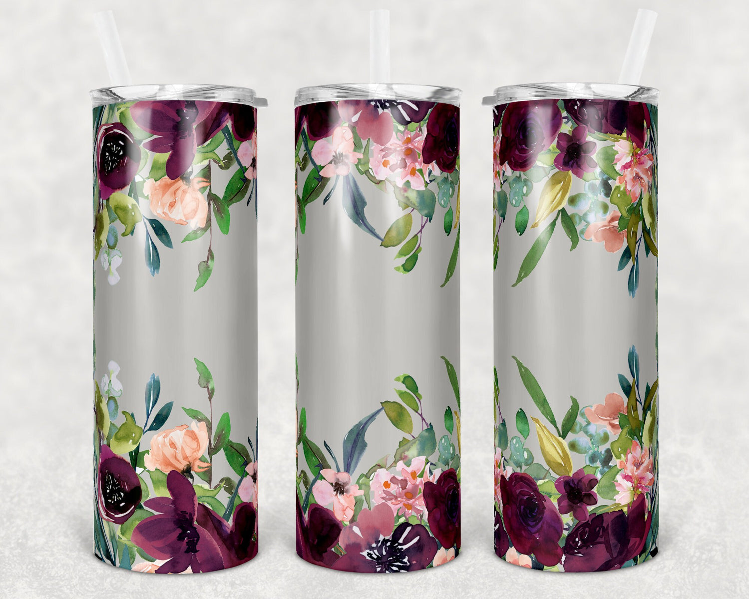 20 oz Skinny Tumbler Gray and Floral Maroon Sublimation Design Print Transfer
