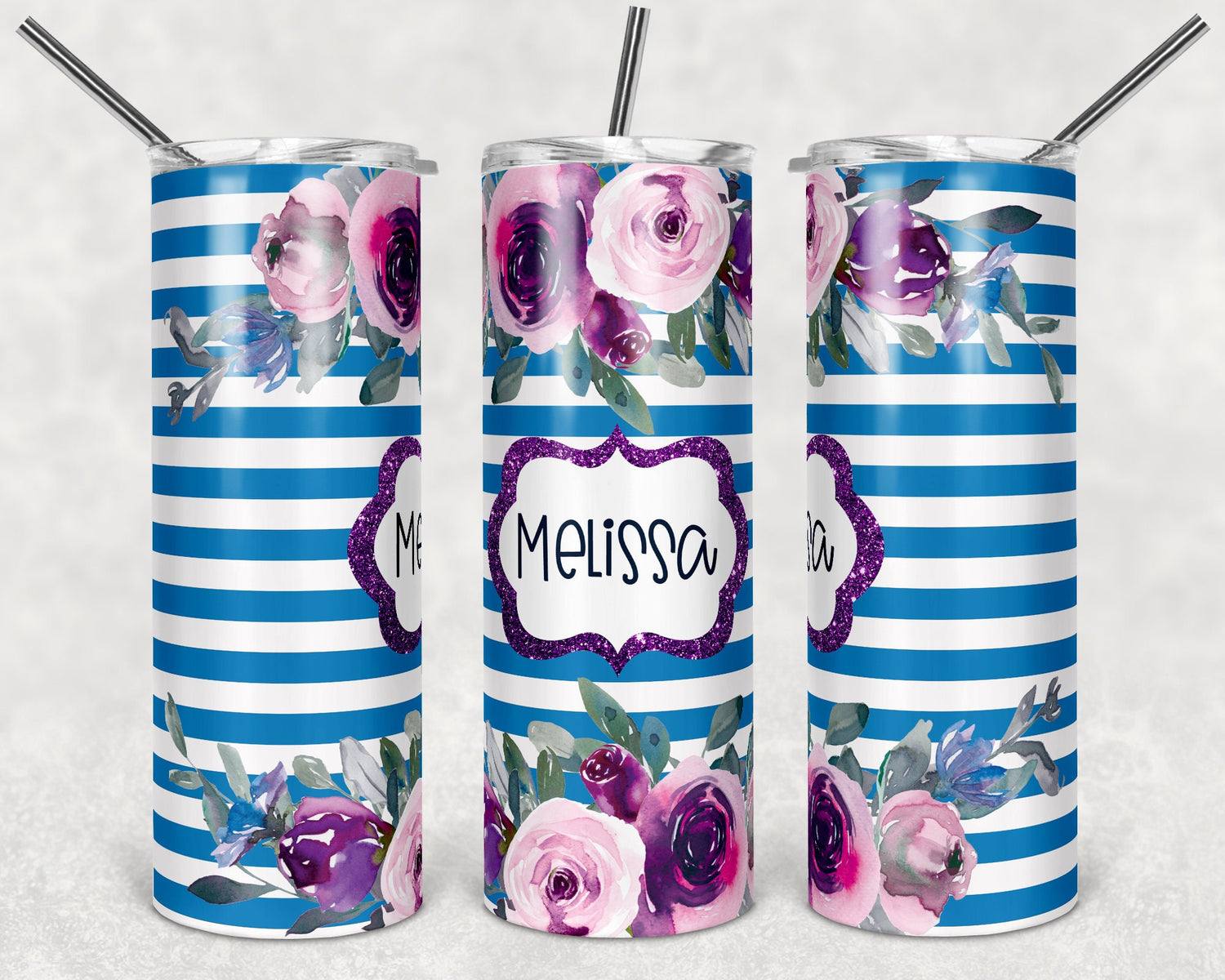 20 oz Skinny Tumbler Striped Floral Blue and Purple Sublimation Design Print Transfer