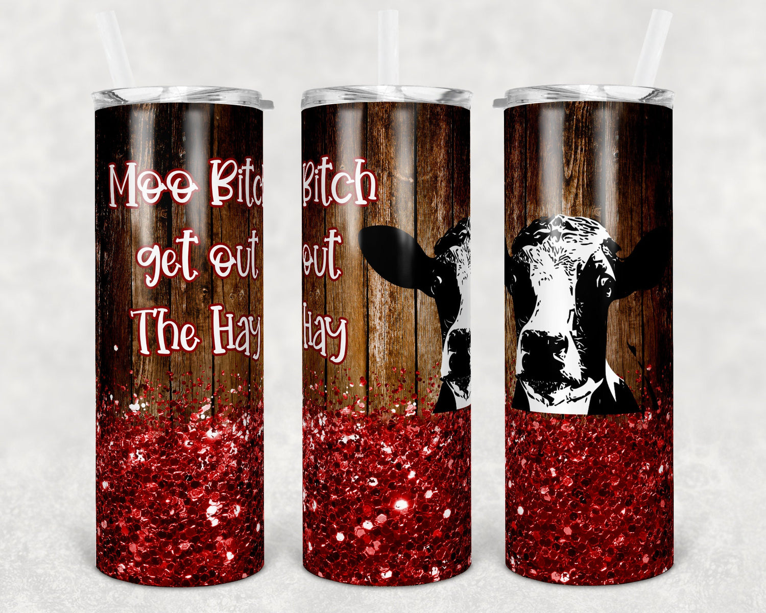 20 oz Skinny Tumbler Sublimation Cow Moo Bitch Get Out the Hay Glitter Design