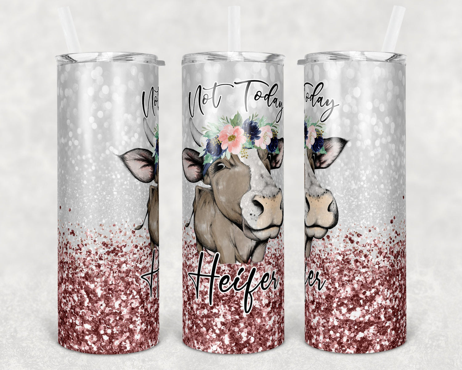 20 oz Skinny Tumbler Sublimation Cow Not Today Heifer Rose Gold Pink Glitter Design