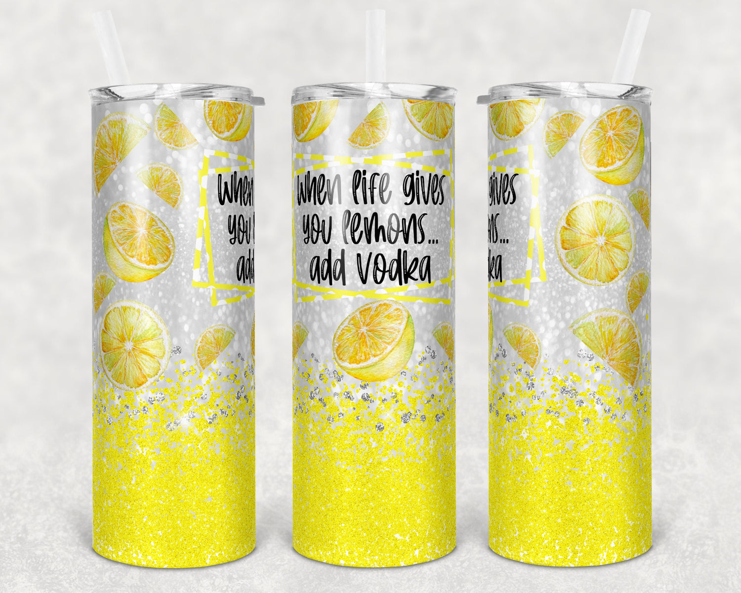 20 oz Skinny Tumbler Sublimation Design Glitter Bright Yellow when life gives you lemons Straight Warped Design