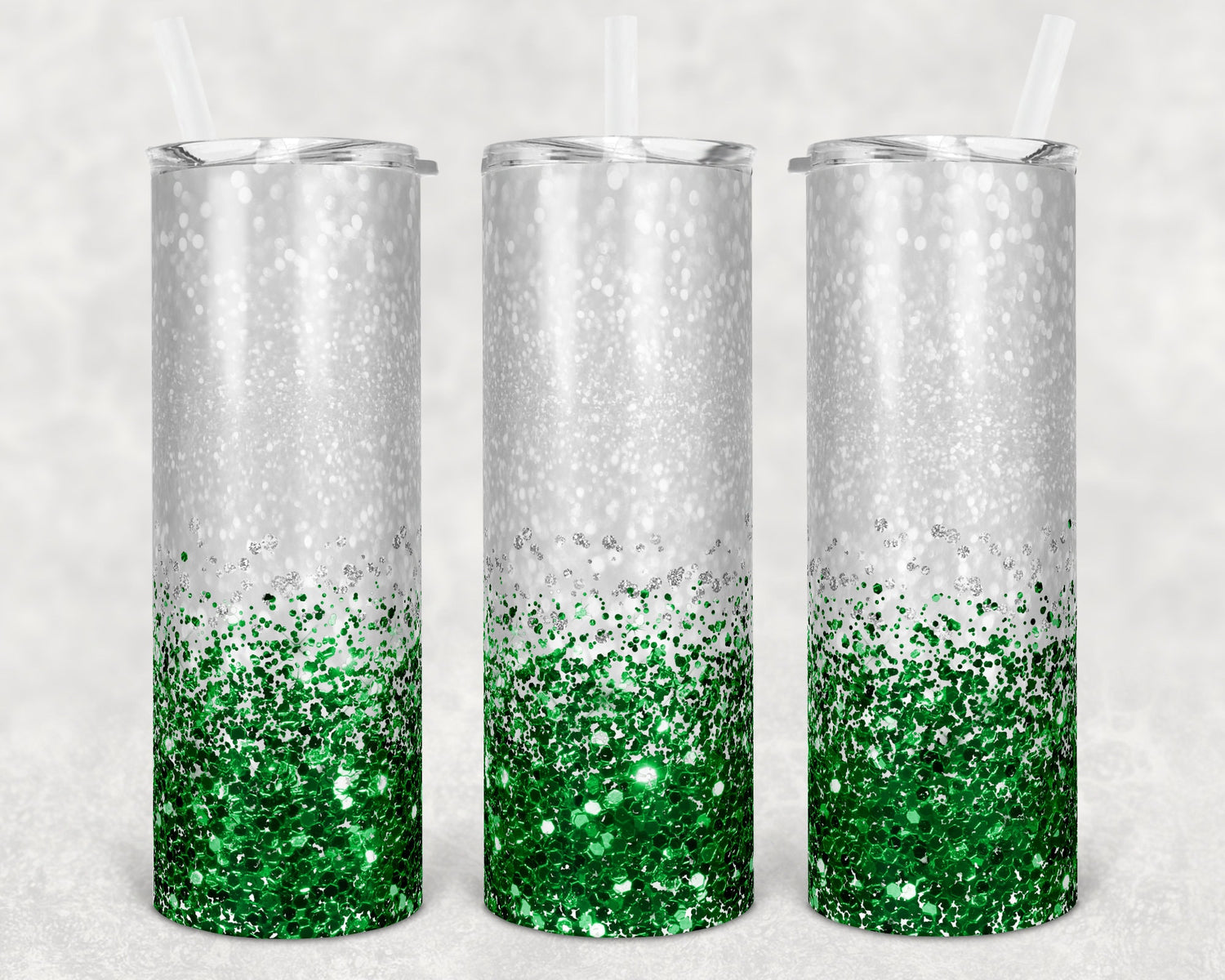 20 oz Skinny Tumbler Sublimation Design Glitter Confetti Green Silver Straight and Warped Design