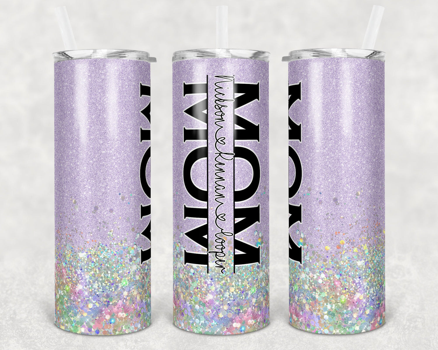 20 oz Skinny Tumbler Sublimation Design Glitter Purple Lavender Split Mom Hollographic add names Straight Warped Design