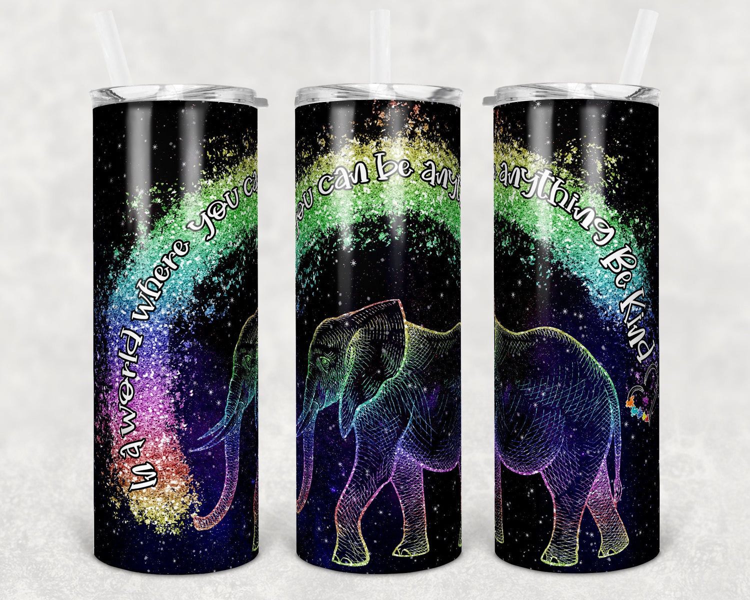 20 oz Skinny Tumbler Sublimation Design Glitter Rainbow Elephant you can be anything be kind Straight Warped Design