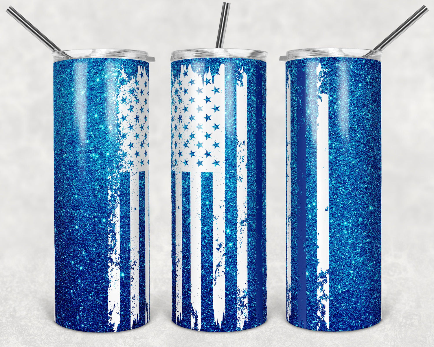 20 oz Skinny Tumbler Sublimation Design Template Blue Glitter Flag Line Design