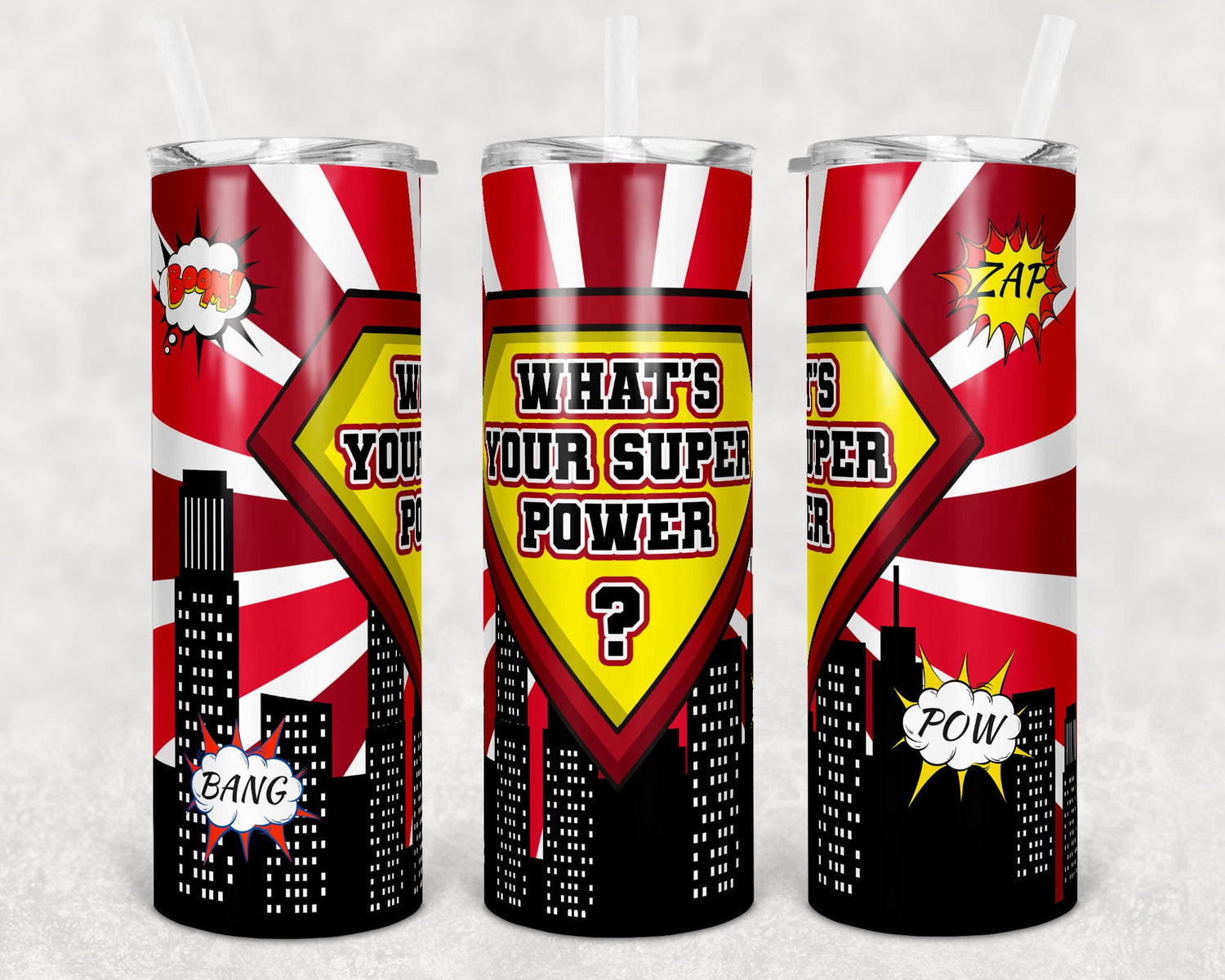 20 oz Skinny Tumbler Sublimation Design Template Super Hero What's your super power Straight Design