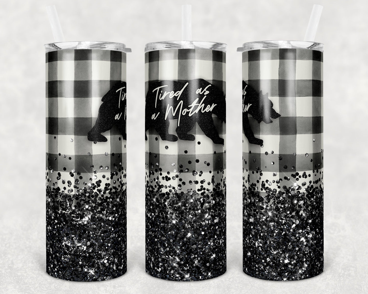 20 oz Skinny Tumbler Sublimation Design Template Tired as a Mother Plaid mama bear Glitter