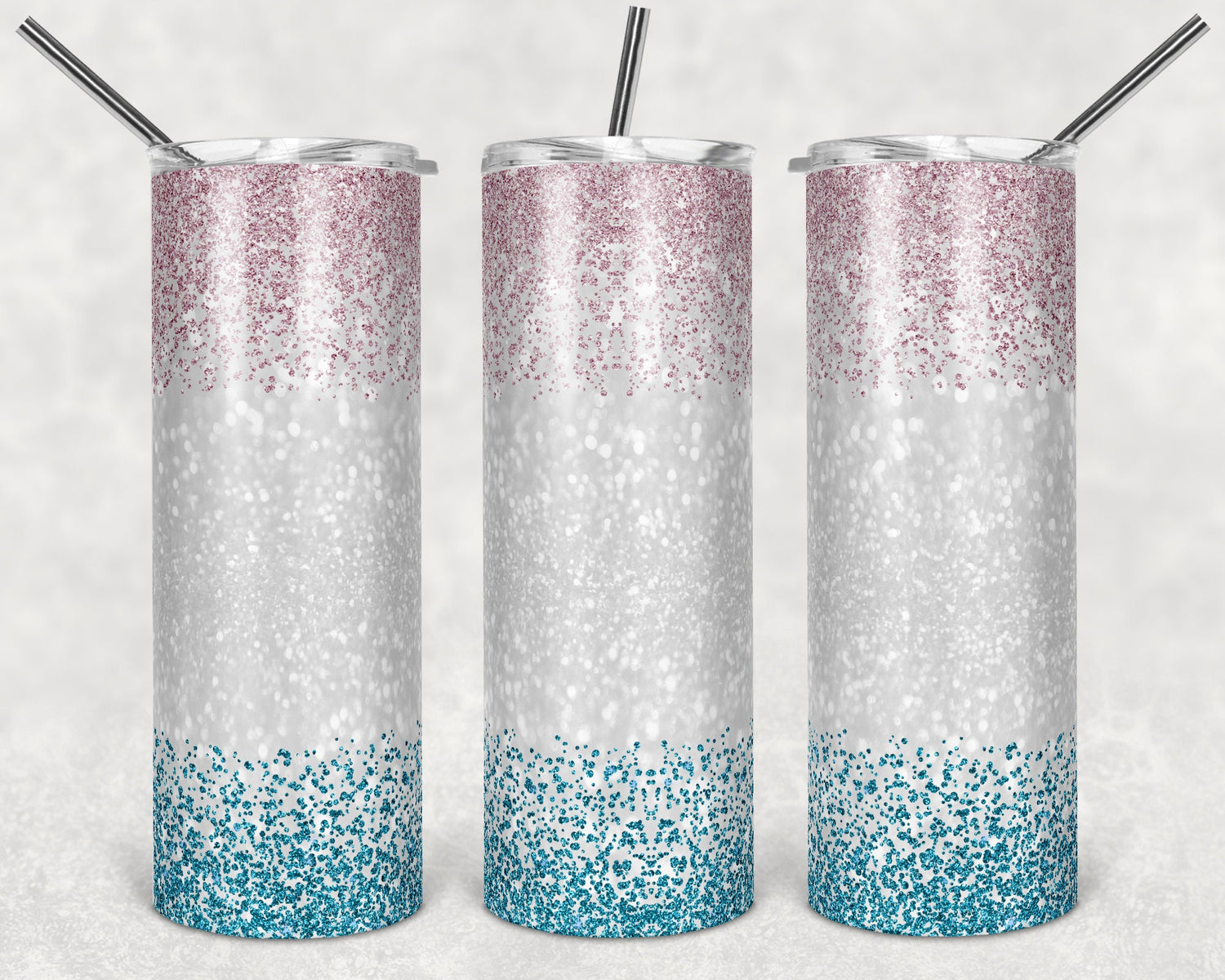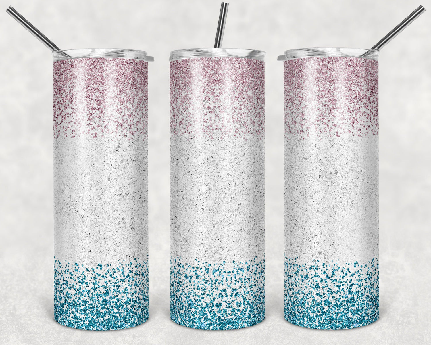 20 oz Skinny Tumbler Sublimation Glitter Pink Blue Confetti Ombre White Center Straight Design