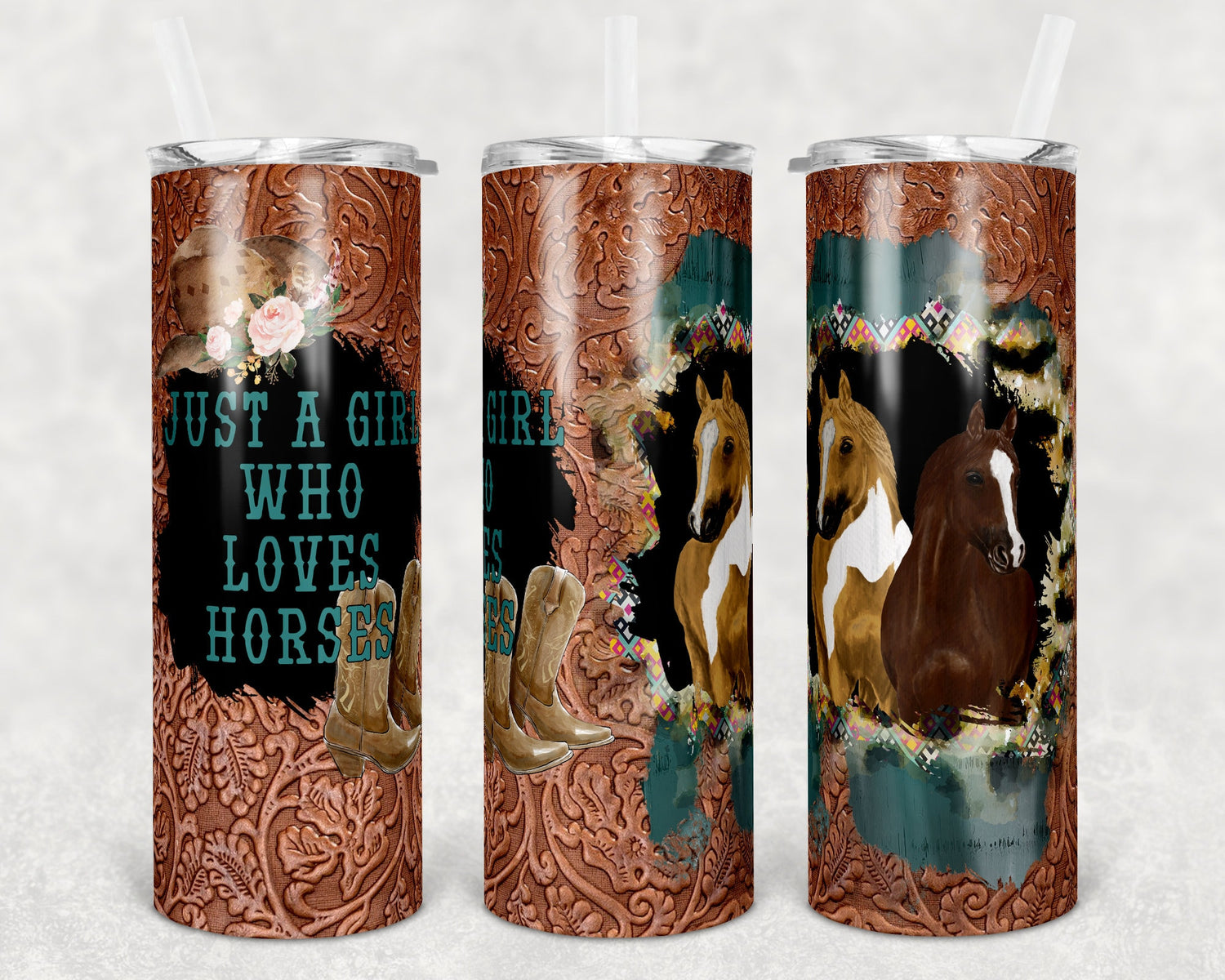 20 oz Skinny Tumbler Sublimation Leather Just a Girl who Loves Horses Straight and Warped Design
