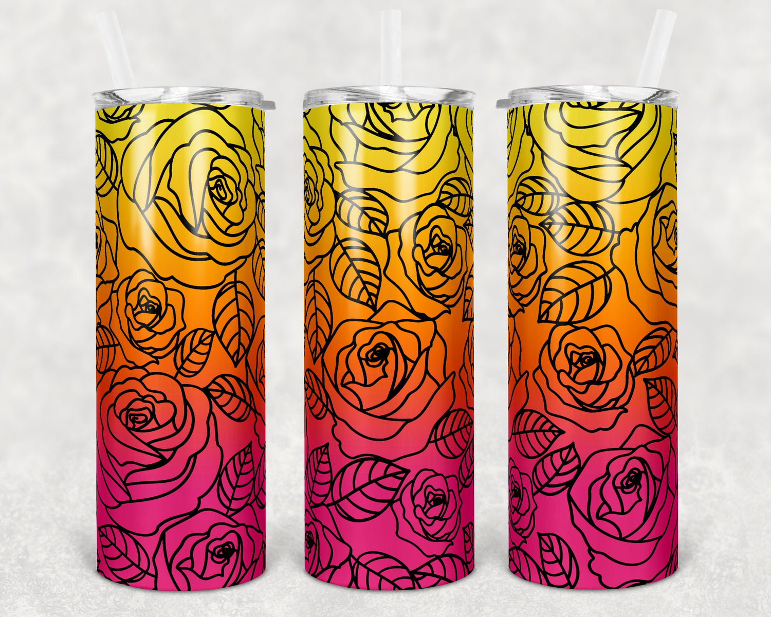 20 oz Skinny Tumbler Sublimation Ombre Pink Yellow Orange Rose Straight and Warped Design