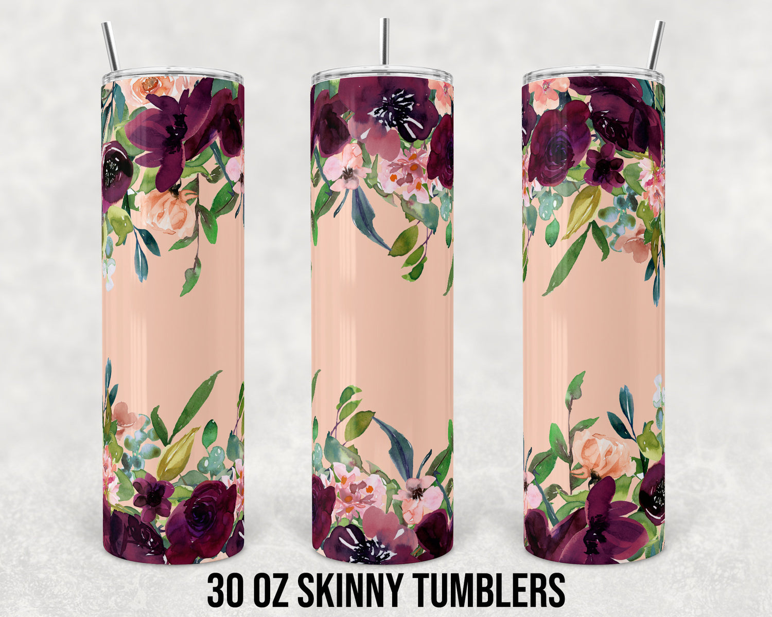 30 oz Skinny Tumbler Sublimation Design Template Peach and Maroon Floral Straight and Warped