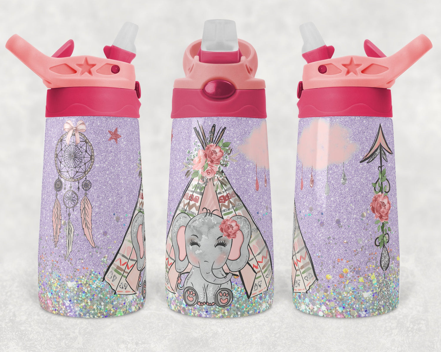 Kids water bottles Sublimation Design Template Elephant Boho Glitter Design STRAIGHT and Warped